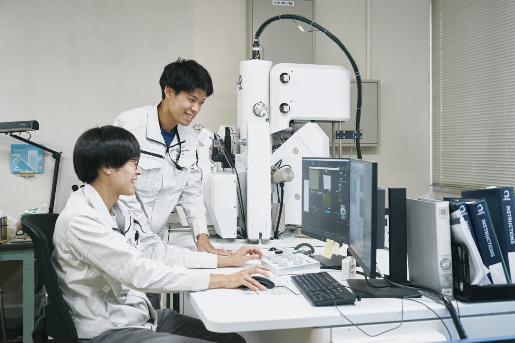 金属を原子レベルでつなぎ合わせるための専用の熱処理炉で、熱や圧力を細かく制御しながら接合を進めています。接合後は、EPMA(電子線マイクロアナライザ)で分析を行い、モニターに映し出されるデータから接合面の状態を確認。さらに、接合面や積層構造などを拡大撮影し、微細な形状まで正確に評価します。