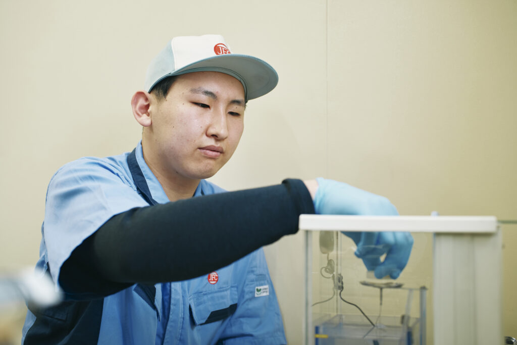 数あるセラミックスの材料を、決められた条件で焼き固める「焼成」という工程を担当しています。必要に応じて不純物を取り除き、焼成するのですが、製品が欠けないよう細心の注意を払い、製品特性に合う焼き方を考えながら取り組むのがやりがいです。製品をうまく仕上げられたときは、達成感を感じます。