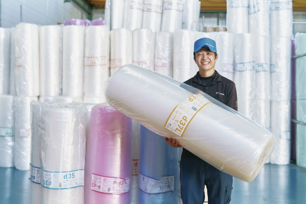 「プチプチ®」は当社の登録商標で、同業界における国内シェア約60%。ハート型の「はぁとぷち®」や、手で切れる「スパスパ®」など新商品も次々に生み出しています。